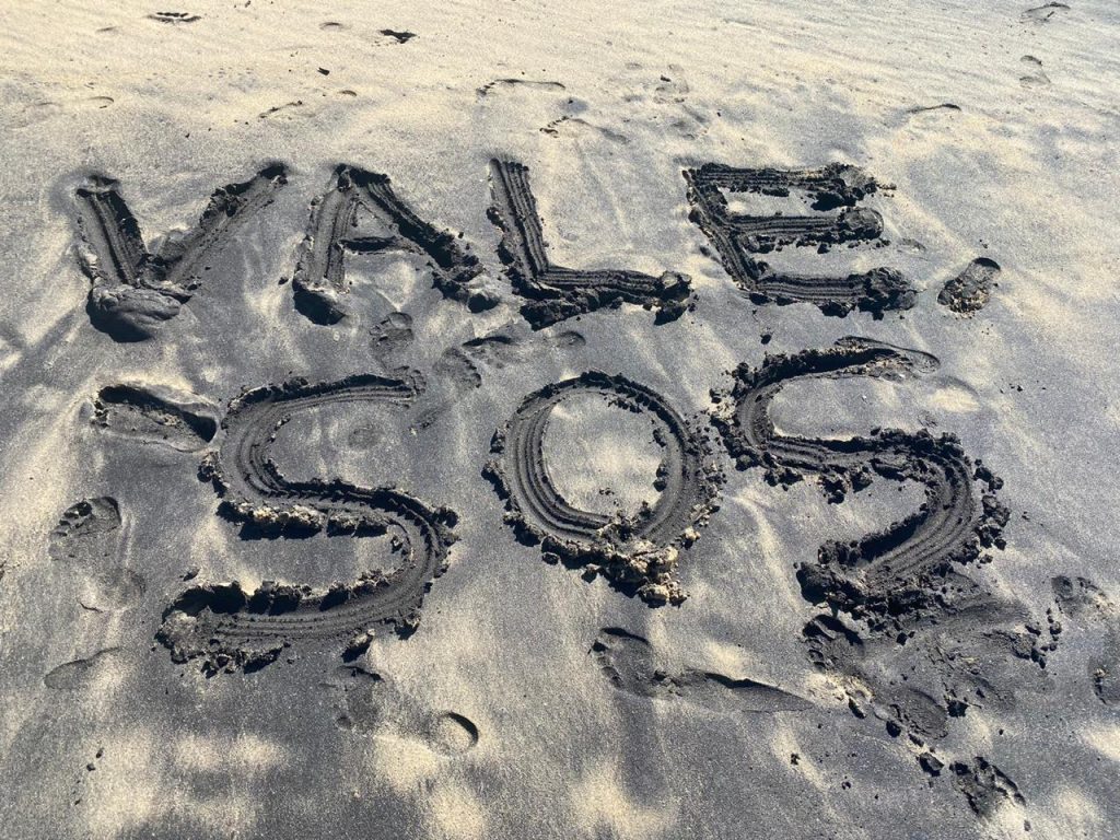 Nas imagens é possível ver a areia tomada por uma camada escura e brilhante de minério de ferro com os dizeres ‘VALE’ e ‘SOS’ escritos.