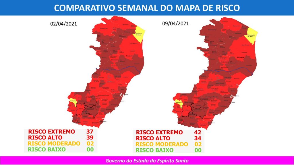 Atualmente, 37 cidades capixabas estão nessa situação. No entanto, cinco municípios que, nesta semana estão no risco alto para a doença, entrarão no risco extremo nesta semana. São eles: Pedro Canário, Domingos Martins, Ecoporanga, Mimoso do Sul e Santa Teresa.