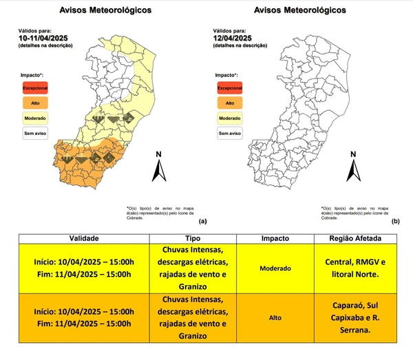 A Defesa Civil do Espírito Santo também emitiu um alerta nesta quinta-feira (10) para a previsão de tempo severo. O boletim aponta a possibilidade de chuvas intensas, raios, rajadas de vento e granizo com alto impacto nas regiões do Caparaó, Sul e Serrana. Já para as regiões Central, Norte e Metropolitana, o risco de transtornos é considerado moderado.