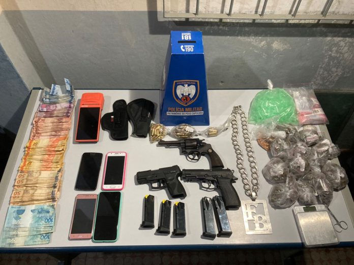 Foram apreendidos durante a ação policial: uma pistola Taurus G2C .9mm, uma pistola Bersa TPR9 .9mm, um revólver Taurus .38, quatro carregadores de pistola sobressalentes, 71 munições intactas (65 cal. 9mm e 6 cal. 38), 309 buchas de maconha, uma carga de crack, R$ 2.651,00, quatro aparelhos celulares, uma balança de precisão, uma máquina de cartão, um cordão prateado e cápsulas e sacolés diversos. Os envolvidos foram conduzidos para a delegacia de plantão em São Mateus.