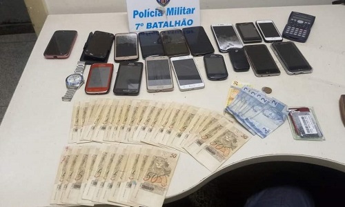 Com o suspeito, foram encontrados 17 aparelhos celulares, além de alguns objetos de valor e R$ 1.800, 00.