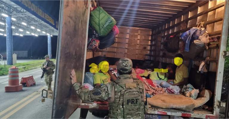 A PRF realizava fiscalização de criminalidade na região quando resolveu abordar o caminhão. Ao verificar o compartimento de carga, encontrou os passageiros deitados sobre o piso do baú, acomodados em cobertores e almofadas.