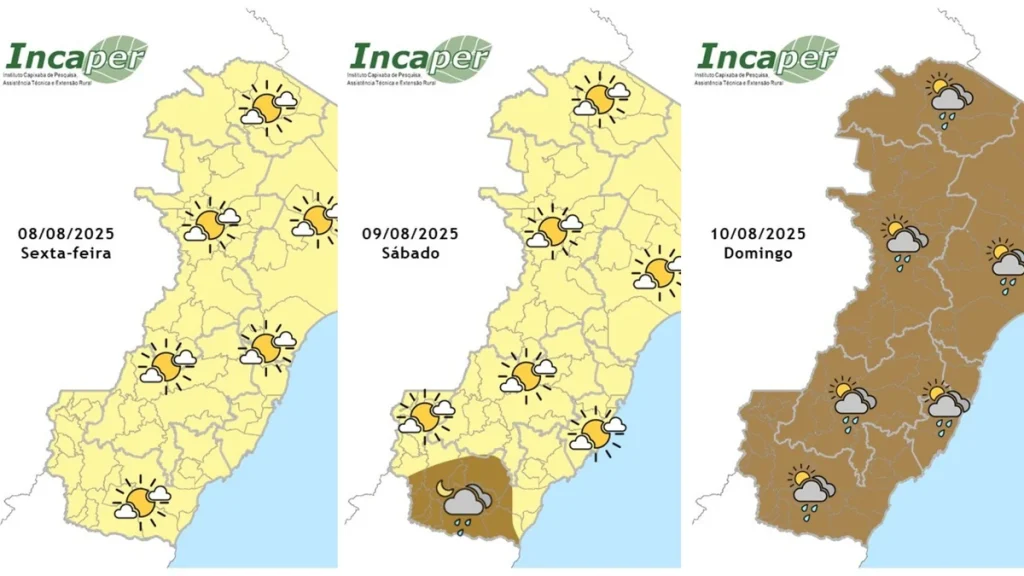 O Instituto Nacional de Meteorologia (Inmet) emitiu um alerta de chuvas intensas para o Espírito Santo, com grau de severidade “perigo potencial”, válido das 15h desta sexta-feira (8) até meio-dia de sábado (9). A previsão é de chuvas entre 20 e 30 milímetros por hora, ou até 50 milímetros por dia, além de ventos com intensidade entre 40 e 60 km/h.